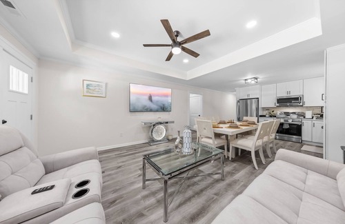 Enjoy cozy evenings in the spacious living area, with plush sofas and a large flat-screen TV perfect for streaming your favorite shows. Natural light floods the space through large windows, creating a vibrant yet soothing atmosphere that feels like home the moment you arrive. Each bedroom offers serene decor and comfortable beds dressed in soft linens, providing restful nights after exciting days exploring Charlotte.