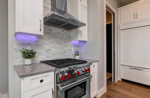 Kitchen: Fully equipped kitchen offers stainless steel Viking appliances. There's plenty of space on the stone countertops and island seating for three.