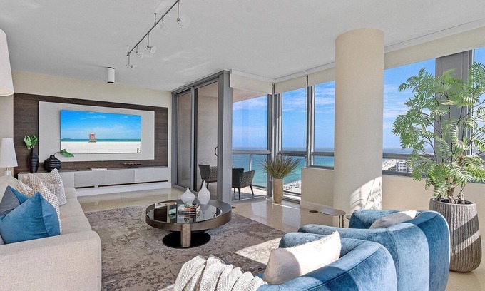 Indulge in the epitome of oceanfront luxury at Ocean & Skyline Tranquility, a breathtaking 2-bedroom, 1,213 sq. ft. direct ocean condo situated on the 30th floor at The Setai Miami Beach. From this vantage point, you'll enjoy unobstructed views of the pristine beach and the endless horizon, courtesy of floor-to-ceiling windows that frame the beauty of the sea beyond. Thoughtfully designed for comfort, the main bedroom offers a plush king bed, the second bedroom a cozy queen bed, and the living room includes a king sleeper sofa, ensuring a restful stay for all.
