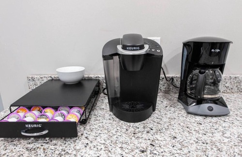 It’s the first place you’ll see as you enter through the side entrance, and it’s ready to help you bring your homestyle cooking to Kentucky. All those essential appliances are here, along with cookware and a dishwasher to help clean up afterwards. You’ll also discover a coffee station with a Keurig and a tray of pods that should keep everyone happy.