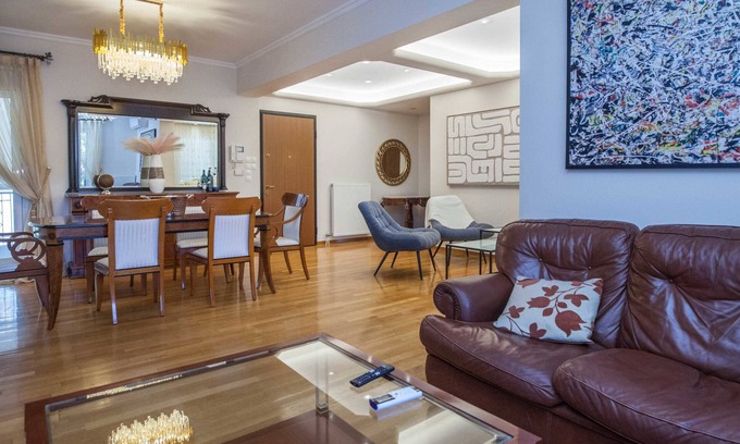 Experience luxury and comfort in our spacious 3-bedroom penthouse, located just 5 minutes from Drosia Square. Ideal for families or groups, this elegantly furnished apartment features a large living room, fully equipped kitchen, three full bathrooms, and two balconies with outdoor seating, offering serene garden views.