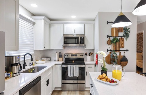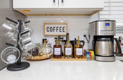 • Cook, snack, or sip in the fully stocked kitchen with a cute coffee bar