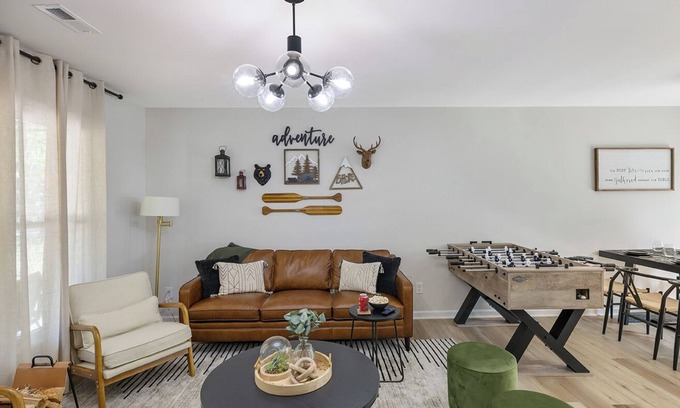 Perfect for families, groups, or business travelers, this home has it all: comfy beds, blackout curtains, sleep sound machine, fast Wi-Fi, a coffee bar, foosball table, and a backyard oasis with grill, fire pit, dining area, putting green, and cornhole. Whether you’re relaxing or exploring, this space was made for connection, laughter, and unforgettable memories.