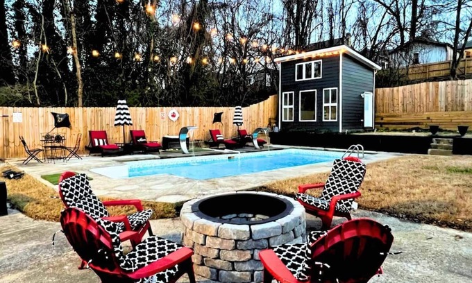 The backyard oasis features a sparkling private pool, perfect for cooling off on warm Atlanta days or simply lounging in style. Surrounded by lush greenery and plenty of seating, the pool area offers a tranquil retreat where guests can relax, play, or soak up the sun. With the added ambiance of nearby outdoor spaces like the fire pit and dining area, the pool becomes a centerpiece for unforgettable moments during your stay.