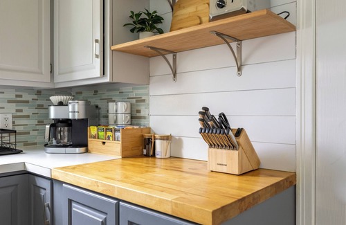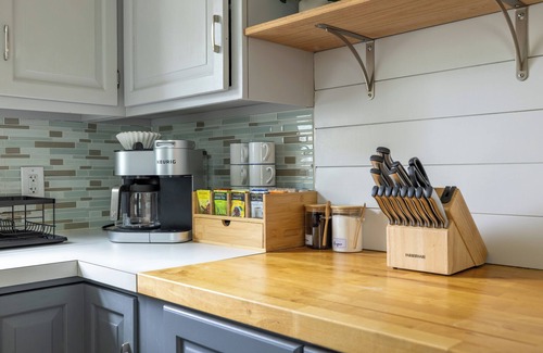 • Kitchen - Cook and dine with ease in a fully equipped kitchen designed for both everyday meals and special occasions. The space includes a gas stove, microwave, refrigerator, and stainless steel utensils for all your cooking needs. You’ll also find convenient appliances like an air fryer, coffee maker, tea kettle, and a toaster to start your mornings right. You'll also find a selection of coffee pods and teas for you to enjoy. For those who enjoy a drink, a set of elegant alcohol glasses are available. Whether you’re preparing a full meal or just a quick snack, this kitchen has everything basic you'll need to feel right at home.