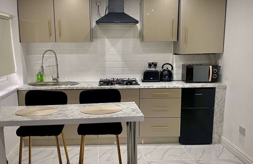 An Open Plan kitchen featuring neutral high gloss cabinets and appliances including a hob, fridge and Freezer. Complimentary Tea & Coffee available.