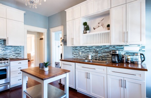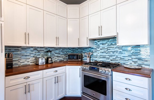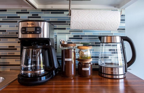 - Fully equipped gourmet kitchen with dinnerware, dishes, glasses, coffee mugs, coffee maker + coffee, pots & pans, large refrigerator, microwave, toaster, stove, oven and dishwasher. Moveable island in the center of the kitchen for easy meal prep.