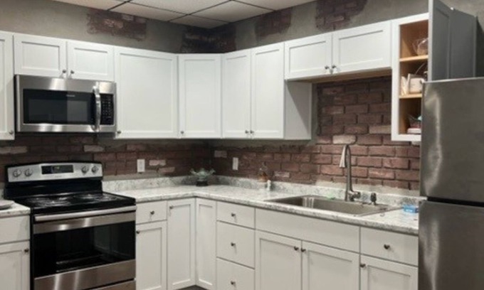 Luxe-Historic Suite in Downtown Monticello. Historic building with luxury accommodations. Lush furniture, brick interior design, and luxurious bathroom. Contains a full kitchen with all necessities, as well as full-size washer and dryer, to meet all your needs! Located in the heart of downtown Monticello with quaint shops, delicious restaurants, and coffee at your front door. Brand new top-of-line King size mattress and bed set, along with a new for 2022 pull-out couch.