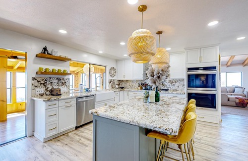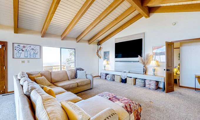 Upon entering this updated home, you will encounter a spacious living area with boho chic decor, cathedral ceilings, exposed wood beams, and plenty of windows flooding the space with natural light. Spread out comfortably on the large sectional and stream favorite shows and movies on the smart TV. Sliding glass doors lead you straight to the extensive wrap-around deck, which offers an unbeatable spot for taking in the incredible views of the mountains, city lights, and sunsets every night. This is a great spot for summertime barbecues as well - you will find a convenient grill and an outdoor dining area. There is also a hammock available that would be great for reading favorite novels with magnificent vistas.