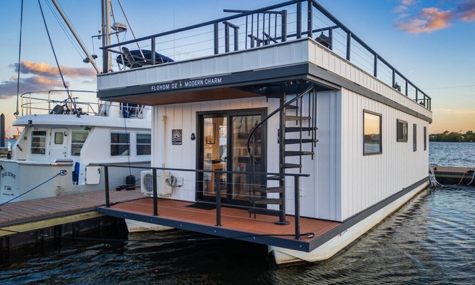 Immerse yourself in luxury aboard FLOHOM 2 | Modern Charm. This two-bedroom, two-bathroom houseboat offers stunning views, modern amenities, and unparalleled privacy. Enjoy sunlit living spaces, a full kitchen, and a fully equipped rooftop deck. Experience unique on-site and on-boat dining at the floating Drift Bar, plus access to a swim club and more. It's the perfect blend of tranquility and city life steps away from the vibrant Canton neighborhood.