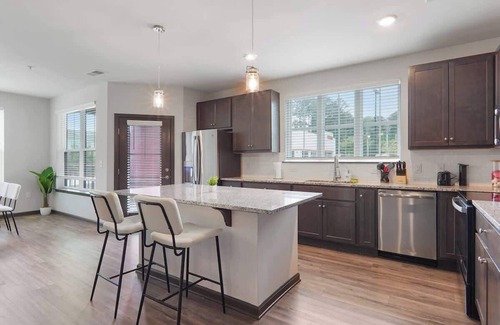 Stay in style in the eclectic city, ranked among the "Best Places to Live" by Money Magazine—Raleigh. This classy 1590-square-foot (~148-square-meters) 3-bedroom, 2-bathroom apartment features a 1 King Bed + 4 Plush Full Beds for your comfort, Lightning Fast Wifi, a Height Adjustable Standing Desk, a Fully Equipped Kitchen, and other Lux Amenities—specially designed for your longer length stays! Step out to a lively neighborhood, close to restaurants, cafés, bars, and shops!