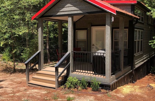 This Luxe Lakehouse is has an outdoor grill and seating area on the front porch. The open layout of this cabin and floor to ceiling windows offers a full kitchen and bathroom, a sunlit living area and a indoor fireplace with smart TV and WIFI. The bathroom is accessible through the hallway leading into the master bedroom. Master bedroom has a smart TV and a queen sized bed with two closets and a built in dresser. The loft includes two twin sized beds with beanbags and games for kids! This cabin comfortably sleeps two adults and four children. This is also the only cabin with a built in washer and dryer!
