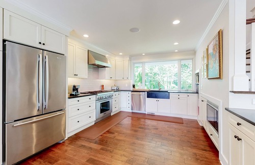 The first-floor interior is a wonderfully open space, where a back wall of windows frame the lawn, the trees, and the lake just beyond. The large kitchen is ideal for entertaining, offering upscale stainless steel appliances, ample cabinet storage, and a peninsula breakfast bar. Arrange appetizers on the adjacent dining table and slide open the glass doors for direct access to the grill and deck.
