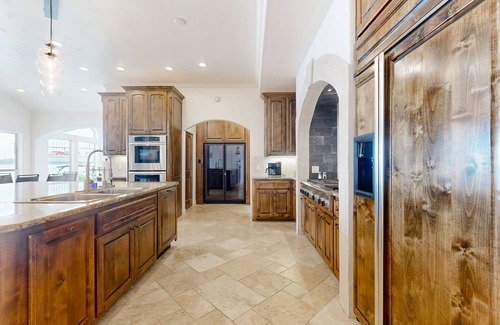 Step outside to over 3,000 square feet of lakeside decks. You'll find a large lakeside dining area with an outdoor kitchen, fireplace, dining for 10, and a 65-inch TV. Enjoy the waterfront swimming pool with the most amazing view of Lake LBJ. Relax in the hot tub, take a nap on one of the hammocks, or enjoy a game of bean-bag toss on top of the large roof-top deck. Guests are free to use the two drive-on PWC docks or the guest wet boat-slip. There are also a number of stand-up paddleboards available and several kayaks for guest use.