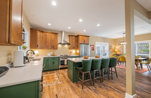 Your stay at Luxe Lodge includes an array of amenities that enhance both comfort and entertainment. Indulge in the brand-new sauna on the top deck while soaking in spectacular views, or unwind in the hot tub after a day of wedding festivities. The open-concept living area features a lavish kitchen equipped with stainless steel appliances and granite countertops, perfect for hosting intimate receptions or family gatherings. Each bedroom is thoughtfully furnished with high-quality linens and mattresses, ensuring a restful night for you and your guests. Additionally, enjoy fun-filled activities such as shuffleboard, billiards, or a cozy movie night with the provided Smart TV and streaming services.