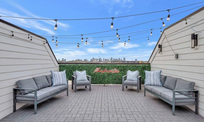 Expansive rooftop with plenty of open seating, string lights, and Nashville neon sign to enjoy the unobstructed views of the Nashville skyline!