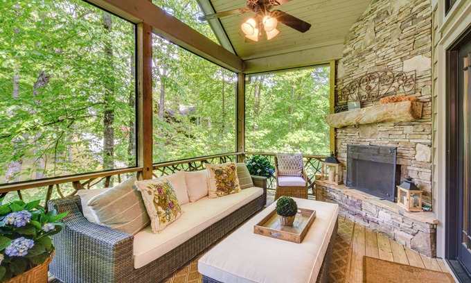 Luxurious mountain chateau meets family-friendly cabin at this spacious 5-bedroom, 5.5-bath vacation rental! Boasting a comfortable upscale interior, an idyllic screened-in porch with a fireplace, and a multi-level deck, this Cullowhee home overlooking the 14th hole of Trillium Links and Lake Club is a great place to unwind. Ready to explore? Hike up to scenic waterfalls, shop in Cashiers or Highlands, or indulge in the community’s resort-style amenities. End the day stargazing by the fire pit.
