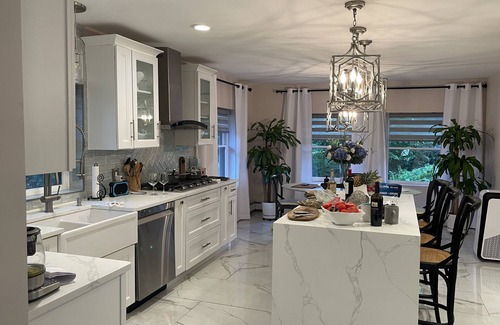 Escape the big city crowds by visiting picturesque Franklin Lakes and staying in this designer 5BR 4.5Bath villa. Explore the local natural landmarks and scenic trails, visit exciting shopping centers and restaurants, or spend an entire day in the fully fenced backyard with the heated swimming pool and the luxurious hot tub.