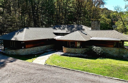 Enjoy a dream getaway at this Talisin certified Frank Lloyd Wright, 2800 square foot, 3 bedroom, 3 bathroom property, nestled in the best of Laurel Highlands nature, just miles from Ohiopyle, Kentuck Knob and Fallingwater. Take in the sun on the back porch; enjoy the summer waterfall fountain, watch the stars from the hot tub and recline in the expansive living room, walk the nearly 4 acres of stream front beauty or simply "unplug" and soak in the quiet of this spectacular home. John Rattenbury was a principal architect and planner for Taliesin Architects until 2003. This home was much in the spirit of Wright's 1938 Life Maganize Dream House. Take time to visit in the home's library and learn more about it's history, while you schedule your trip to Fallingwater or Kentuck Knob!