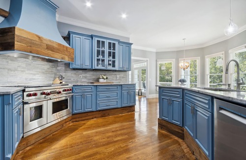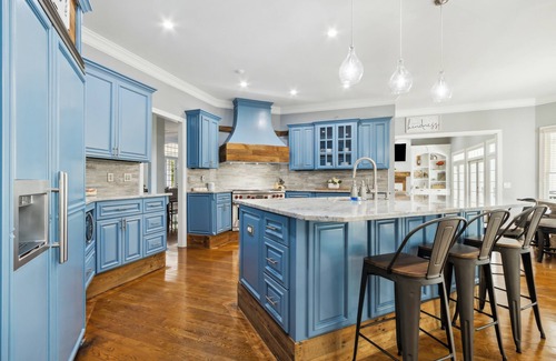 You can also relax on the balcony overlooking the tree-lined backyard or enjoy making s'mores around 2 backyard fire pits. Your entire crew will fit nicely in the dining hall opposite a full size chef's kitchen on the bottom floor, or enjoy a more intimate gathering in the main floor dining room which seats 8 comfortably. The main floor kitchen offers an open floor plan flowing directly into the breakfast area, living room, and bonus room.