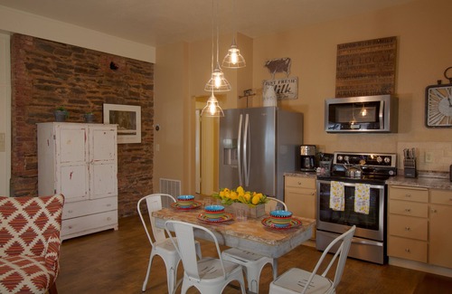 Welcome to Lemon Drop Loft. This newly restored second-floor 900 sq ft circa 1860s historic building has a private entrance easily accessed from an outside staircase. It comfortably accommodates 4 guests with two bedrooms, each with a queen size bed. 2 additional guests can utilize a futon in the sunroom. The full bath has a splendid waterfall shower. The great room is tastefully decorated with sitting area, cable TV, Blu-Ray player, DVD’s, free Wi Fi, dining table and a full kitchen should you choose to prepare your own meals. The kitchen is highlighted with stainless steel appliances, including a range, microwave, dishwasher, and refrigerator. This well-appointed kitchen includes pots, pans, dishes, silverware, cutlery, glasses, mixing bowls, cookie sheets, a toaster, 10-cup coffee maker, mixer, blender, towels, dish soap, and dishwasher soap. The sunroom is bright and cheery and can accommodate an additional one to two guests utilizing a comfortable futon. In addition, the sunroom can serve as a private office space with use of a printer. The laundry room located off the sunroom has a washer and dryer. Tide Pods are provided for washing needs. Free parking is available on our adjacent property as well as free street parking.