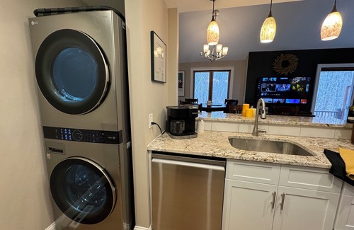 The home has a desk set up in bedroom 2, 1Tb high-speed internet, and many USB B and C outlets throughout. The kitchen has full-size modern appliances, including a dishwasher, coffee maker, Keurig, filtered water and ice, dishes, pots, pans, and utensils. The bedrooms and linen closet are well-supplied with sheets, towels, and blankets.