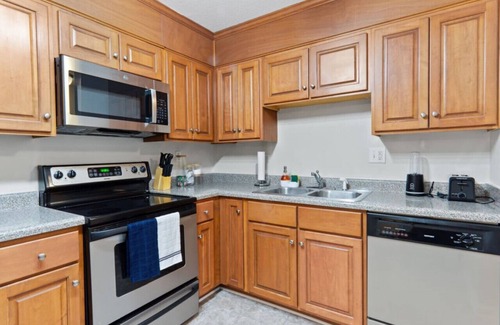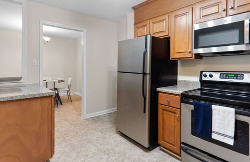 Stay in style in the eclectic city, ranked among the "Best Places to Live" by Money Magazine—Raleigh. This classy 960-square-foot (~89-square-meters) 2-bedroom & 1-bathroom apartment features 1 King Bed & 2 Plush Full Beds for your comfort, Lightning Fast Wifi, a Separate Workstation, a Fully Equipped Kitchen, and other Luxury Amenities—specially designed for your longer length stays!
