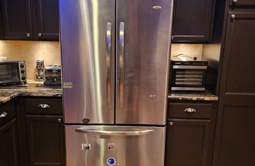 The kitchen sits adjacent to both living spaces, creating a seamless and everyday comfort. It’s fully equipped with granite countertops, a granite sink, stainless steel appliances, and ample cabinetry—ideal for everything from morning coffee to full home-cooked meals during extended stays. the main floor also has a 1/2 Bathroom and a laundry room.