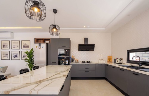 Experience unparalleled luxury in this exquisite BRAND NEW Hammamet villa, featuring four bedrooms, each with stunning en-suite bathrooms, and an elegant open-plan living room and kitchen overlooking a beautiful inviting pool. Unwind in the dedicated games room with a pool table or entertain your guests in the rooftop barbecue area, offering breathtaking views and ample space for evening relaxation. This villa promises comfort, elegance, and endless enjoyment. Walking distance to shops and beach