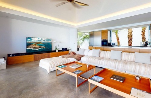 Built on two levels in a modern style, the luxurious villafeatures a sleek and sophisticated design with white walls and polished concrete floors that provide a delightful sense of freshness. On the main level, the large indoor living room furnished with a sofa and benches opens onto the long, heated swimming pooland the terrace swept by tropical breezes.