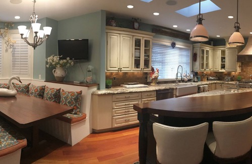 8 person banquette dining area, 4 island barstools with plenty of room for mingling.
