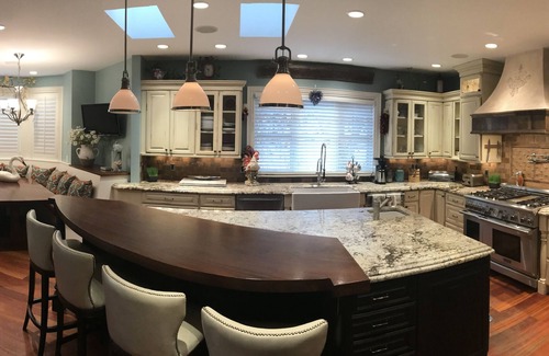 Large Chef's Kitchen with an open floor plan, lots of seating and natural light, great for entertaining.