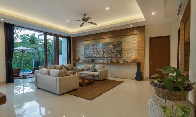Your cozy getaway awaits in Ubud at this delightful villa. With 6 bedrooms offering a mix of full, queen, king, and twin beds, this tremendous property is perfect for large groups. Enjoy the cool amenities like AC, WiFi, and a jetted bathtub in each of the 6 bathrooms. Plus, there's an additional living room space with a comfy sofa bed for extra guests. We look forward to hosting you at our place.