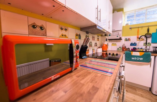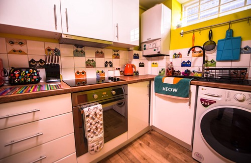 Funky colourful kitchen with lavazza coffee machine and milk frother, built in oven, hob, washer/dryer, microwave, fridge freezer.