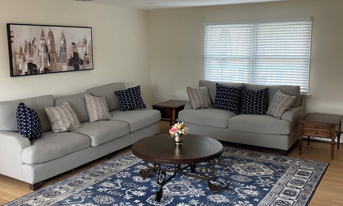 Enjoy single-level living in the desirable Mount Carmel neighborhood of Hamden! This renovated 4BR/2BA ranch offers a spacious living room, modern kitchen with quartz countertops & new appliances, central air, a cozy den, and in-home washer/dryer. Accessibility features include a ramp. Relax on the outdoor patio or enjoy over 1.5 acres of yard space on a quiet cul-de-sac. Perfect for families or getaways—book your stay in this suburban retreat today!