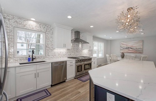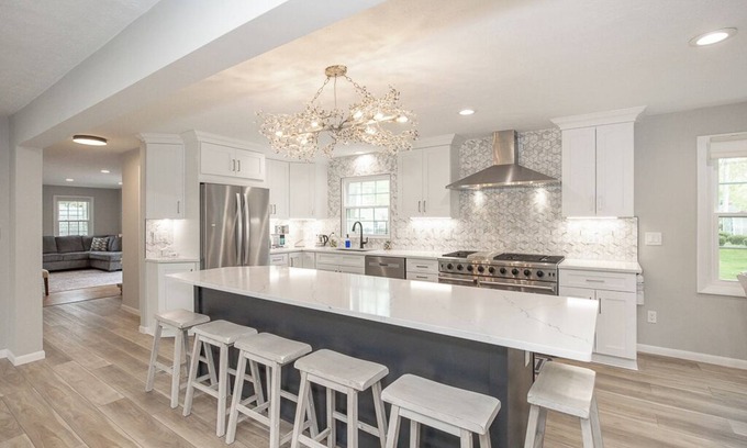 Welcome to this newly renovated luxurious home designed to comfortably house multiple families or a group looking for a wonderful getaway. The large kitchen boasts a 9 foot island with a 48 inch industrial stove and double oven. The open living room allows for comfortable gatherings while the family room allows for a secondary gathering area. The five bedrooms allow for comfortable sleeping arrangements with two en-suite bathrooms, six bunk beds, four king beds, and two futons. House is located minutes from Avon Point Park and the Avon Lake boat launch. Neighborhood has plenty of restaurants, coffee shops, grocery stores, parks, and anything else you might need for the ideal family getaway.