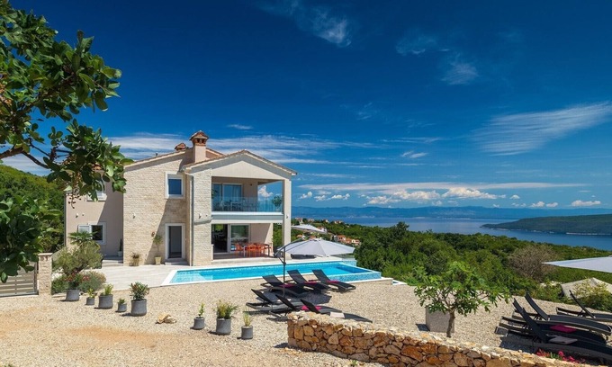 Apartment Cres is located on the middle floor of Villa Istra Panorama with unobstructed, impressive sea views of the island of Cres and Krk and the Kvarner Bay to Rijeka. Here you can enjoy your vacation in this spacious and luxurious room. The living room with open kitchen stretches over 54 m² and is connected to the outdoor fireplace and grill via the sliding door to the covered terrace. Much emphasis was placed on luxury. In front of them is the 11 meter long infinity pool with enough space for loungers all around. The pool is heated until early November and in spring from April. The luxurious master bedroom with direct access to the open bathroom with free-standing bathtub and large single shower pampers you with a sea view from the double bed or directly from the bathtub and also offers two single sinks and a bidet .. A table tennis table is also available outdoors and of course free WiFi. For cyclists, there is a separate lockable room with direct access from the outside to always park your bikes safely. On cooler evenings you can enjoy the view of the sea by the open fire or prepare your dinner on the covered terrace on the barbecue. You can experience a healthy, relaxed Mediterranean lifestyle instead of stress, noise and fog here in autumn, winter and spring. Already at the end of February the first almond trees bloom next to the villa. In the 105 sqm apartment, you can use the underfloor heating in the entire area, which is operated environmentally friendly and reliably via an air heat pump.