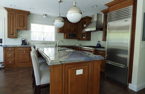 The gourmet chef's kitchen overlooks the pool and features high end appliances including a Wolf 6 burner gas range, Bosch dishwasher and Subzero refrigerator with an ice maker, beautiful marble countertops, an eating island w/ a separate prep sink, and a Nespresso machine for your morning brew!