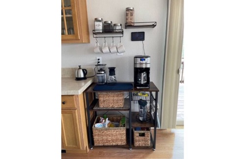The coffee bar includes whole beans, a grinder, pourover, and a traditional drip coffee machine. Hot chocolate and tea are provided as well as instant oatmeal.