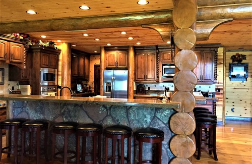 The first floor of the cabin also includes a spacious kitchen, dining room and living area. There is also a half bathroom, computer area and a laundry room. The living room / dining room has excellent window views of the lake and surrounding mountains. The cabin also has a two-car garage and other cemented areas for multiple cars.