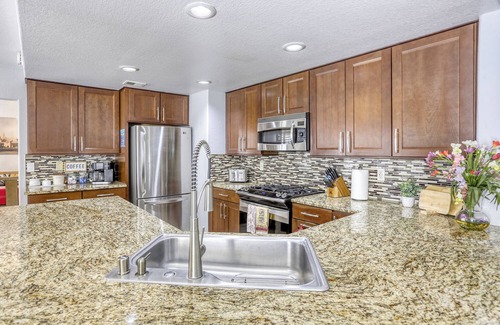 Make delicious gourmet meals in the fully equipped kitchen with spacious granite countertops that extend into a vast kitchen bar. Start your day with a cup of fresh coffee and tasty breakfast. We recommend serving it in the sunny backyard patio for a perfect start to the day.