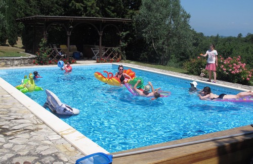 Ripertoli is a 1000-year-old farmhouse 20 km south of Florence, in its own secluded 40-acre-estate, with magnificent views of the Tuscan countryside. It sleeps up to 17 comfortably, in a main house and 2 close-by cottages. We only let the property as one unit to a single client at a time; the main house can be rented on its own, and either or both capanne can always be added on later if required. There are 8 double bedrooms, each with its own ensuite bathroom, a lovely large pool with a heat pump for early and late season swimming and an electric cover for child safety, and over an acre of well-irrigated garden. The property is furnished and maintained to a very high standard, and is fully air-conditioned.