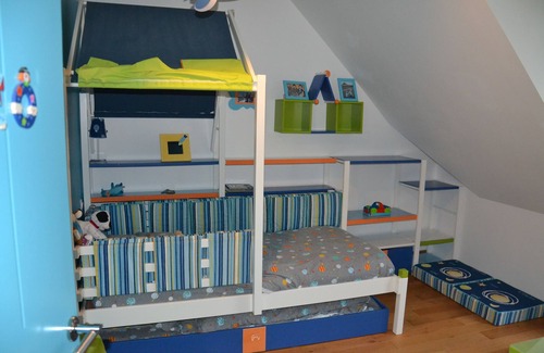 Upstairs You will find a 35m2 playroom with TV / DVD installation, sofa, numerous games, board games, table football and darts. Children's paradise! Away from sleeping areas.
