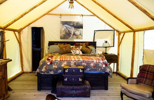 Experience the thrill of glamping outdoors with all of the amenities and luxuries of a hotel. Savor your morning coffee or evening drink on the adirondack chairs on the deck. Cuddle up in front of the wood-burning stove...enjoy the sounds of the coyotes howling from your Ralph Lauren covered king size bed. Enjoy the indoor rock & marble shower or a fabulous shower in your private outdoor shower! Enjoy complete privacy while surrounded by just under 1 million acres of National Forest.