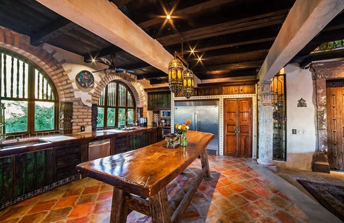 The property features luxurious amenities such as a 40-foot heated swimming pool adorned with traditional Talavera tile and Venetian glass, ideal for lounging or hosting outdoor festivities. The authentic Mexican cantina opens up to a sprawling 1,000 square foot veranda, perfect for mingling as you take in the stunning 270-degree panoramic views. The fully stocked gourmet kitchen makes catering your event a breeze, whether you're preparing intimate meals or hosting larger gatherings. An expansive lawn and courtyard area set the stage for unforgettable wedding ceremonies and receptions, while an advanced indoor/outdoor sound system ensures that every beat of your celebration resonates throughout the venue.