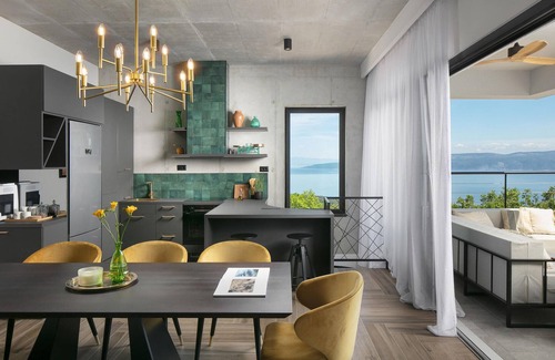 Villa The View is located in Istria in the town of Crni and represents true luxury for every guest looking for a perfect holiday in peace and quiet. If you are desperate to escape the hectic lifestyle and treat yourself and your family to the best of the best, then Villa The View is for you! As soon as you enter the villa, you will be won over by the beautifully decorated interior, combining modern and contemporary, and the sea views from every room will take your breath away! It was built in 2023 and offers 396 m2 of living space, while the total area of the property is 827 m2. The nearest pebble beach Sv. marina is 2 km away. This fully air-conditioned villa can accommodate a maximum of 8 people in 4 bedrooms, one of which is located on the ground floor and the remaining three on the upper floor. Two bedrooms have a double bed (200x210 and 180x200) and the remaining two rooms each have two single beds that can be put together to form a double bed (180x200). In addition, all 4 rooms have their own bathroom: 3 with a shower and 1 with a bath. Each room has its own terrace with seating where you can enjoy your morning coffee or read the newspaper. On the ground floor, you have the opportunity to prepare meals for family and friends thanks to the modern and fully equipped kitchen with bar and two bar stools. Right next to the kitchen is a dining room with a dining table, next to which there is a direct exit to the outdoor terrace. The living room is an ideal place for evening gatherings and watching your favourite films or series. It contains a sofa, an armchair, a coffee table, stools, a romantic fireplace and a TV. The outdoor terrace offers the best: a view of the Adriatic Sea while you swim in an illuminated pool of 36 m2 and a depth of 1.45 metres. The pool is heated in the early and late season. There are 8 sun loungers on the lawn next to the pool where you can enjoy the sun's rays and rest your body and mind. Of course, there is also outdoor seating and a small table on the terrace. There is also a summer kitchen, an outdoor gas barbecue and an outdoor dining table with seating for 8. From here you can enjoy summer evenings and enjoy an unobstructed view of the sea, the towns of Rijeka and Rabac and the island of Cres. Lovers of a delicious drop of wine will be delighted by the wine cellar, where they can play billiards in good company. Children will also enjoy the games room, where there is a PlayStation 4, and they also have access to Netflix and Disney Plus channels. You can play darts and billiards in the villa. Additional amenities available during your stay include a washing machine, tumble dryer and ironing facilities. There is also 1 separate toilet, a food dispenser and a cot, which will be a great help when the little ones come on holiday with you. The courtyard of Villa The View offers 4 private parking spaces and a charger for an electric car. Only 8 km away from the villa, on a hill, lies Labin, a medieval town full of beauty and unspoilt nature, where you can enjoy a magnificent view of Rabac, Cres and the Labin surroundings from the town's fortress. Go shopping in small, elegant shops and refresh yourself on the terrace of one of the cafés or restaurants. Welcome to Istria, a real little paradise on earth that you will never want to leave and come back to next year!