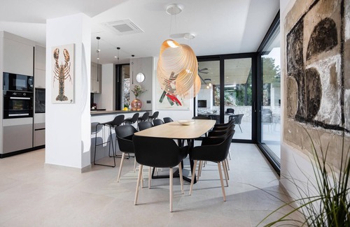 The villa was built in 2022 in a contemporary construction style, it offers its guests 435 m2 of living space, while the total area of the property is 1082 m2. It is only 400 metres from the nearest sea, which is an excellent opportunity for a pleasant refreshment in the clean and clear Adriatic Sea. Likewise, from this villa, you will be able to enjoy a beautiful view of the sea whether you are on the outside terrace or in the bedroom. The Divine View villa offers accommodation for a maximum of 16 people, while the optimal number is 10. You will be comfortably accommodated in 5 bedrooms (200x200), and all of these rooms have their own ensuite bathrooms with showers. There are 3 rooms on the 1st floor and two more on the 2nd floor.
