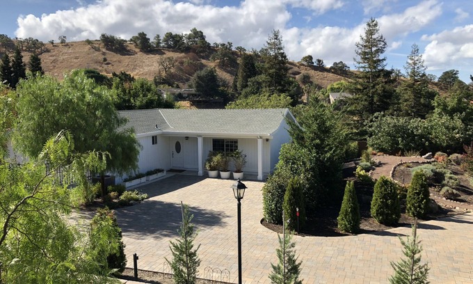 Great alternative to extended stay hotels, the Brodia Garden House, sitting on 1-acre property, offers a luxurious spa-like setting within minutes of Walnut Creek amenities, BART and highway. With spectacular views, juxtaposed to Shell Ridge hiking trails, this luxurious 2-bedroom (master with king bed; second bedroom with two single beds), 2 bath guesthouse sits on a spacious garden property, offers a private setting, with automated gate, ample parking, comfortable living area with 60 inch Samsung TV, dining area, modern kitchen (with Keurig coffee maker, Aqua Pure water filter, wine cooler), separate office room, and large bedroom with TV, 2 full luxurious bathrooms, laundry facilities, relaxing open back porch veranda. House wired for high speed internet, 2 smart TVs, fully solar powered. The ultra experience in comfort. Make your next extended stay in the Bay Area something special!