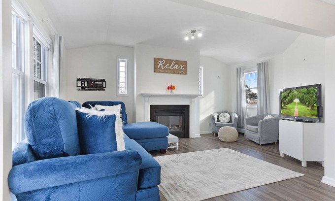 The living room boasts a flat screen TV with Roku entertainment and an oversized couch which can sleep an extra person.