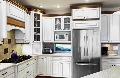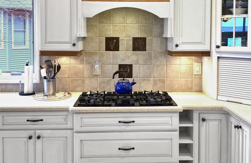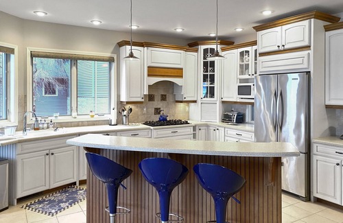 • Kitchen with large 6 burner gas range, two full-size ovens, microwave, toaster oven, coffee maker, dishwasher, blender, pots & pans, baking dishes, and a full size refrigerator /freezer. Dining area has table that seats 4. Island with seating. Desk area.